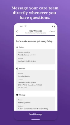 - Message your care team – Contact your care team whenever you have questions through quick, secure direct messages.