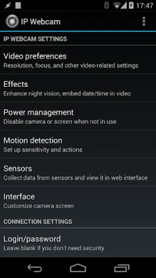 IP Webcam turns your phone into a network camera with multiple viewing options. View your camera on any platform with VLC player or web browser. Stream video inside WiFi network without internet access.