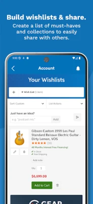 - Build Your Wish List — Are you the type of gearhead who keeps several wish lists at a time? You’re in good company! The Sweetwater app makes it easy to dream big and keep your favorite guitars, drums, and effects plug-ins saved for future purchasing ease.